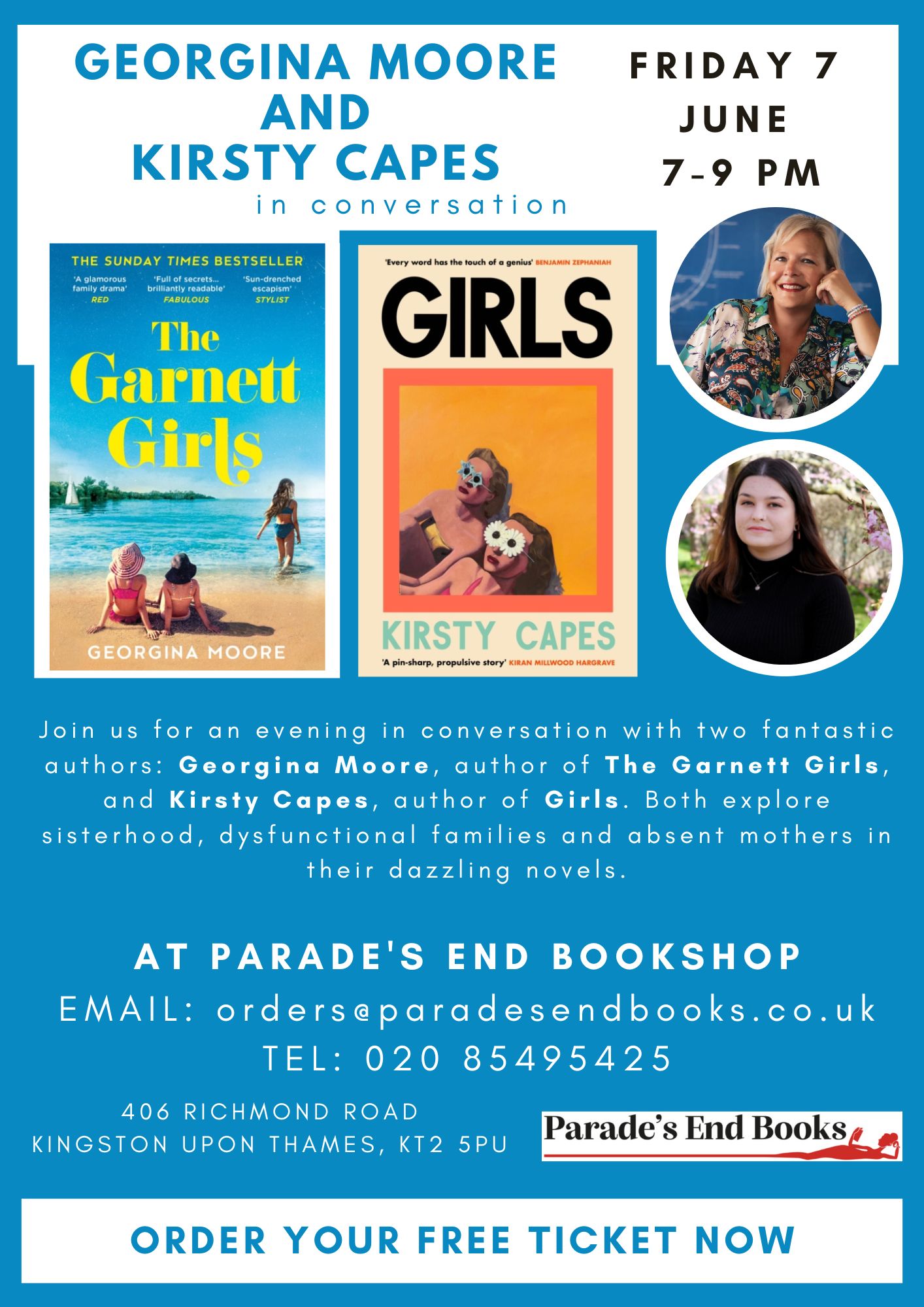 This is a ticket for 1 person for an evening with authors Georgina Moore and Kirsty Capes on June 7th